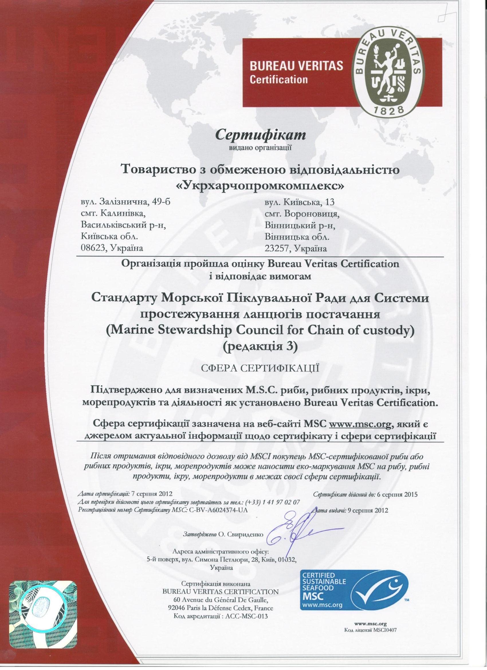 - The enterprise has been certified for compliance with the requirements of the A.P.A.I.F. Version 5, which is assessed as the safety of the grown products (aquaculture), the safety of the entire production cycle and finished products. Obtaining the certificate of conformity enables the company to process raw materials and manufacture finished products, which are then supplied to European retail chains. The certification allowed UKRKHARCHOPROMCOMPLEX LLC to increase the volume of processing of products for the European market by 30%. To date, the Company is the only fish products manufacturer that has been certified for compliance with this standard, which is another advantage of UKRKHARCHOPROMCOMPLEX LLC.