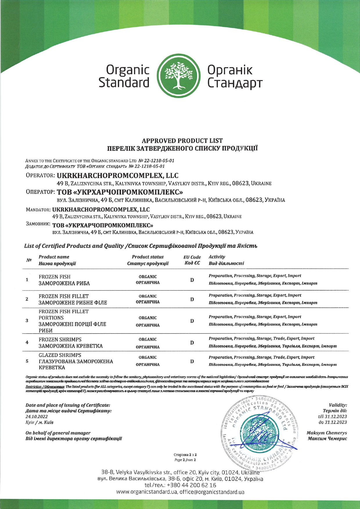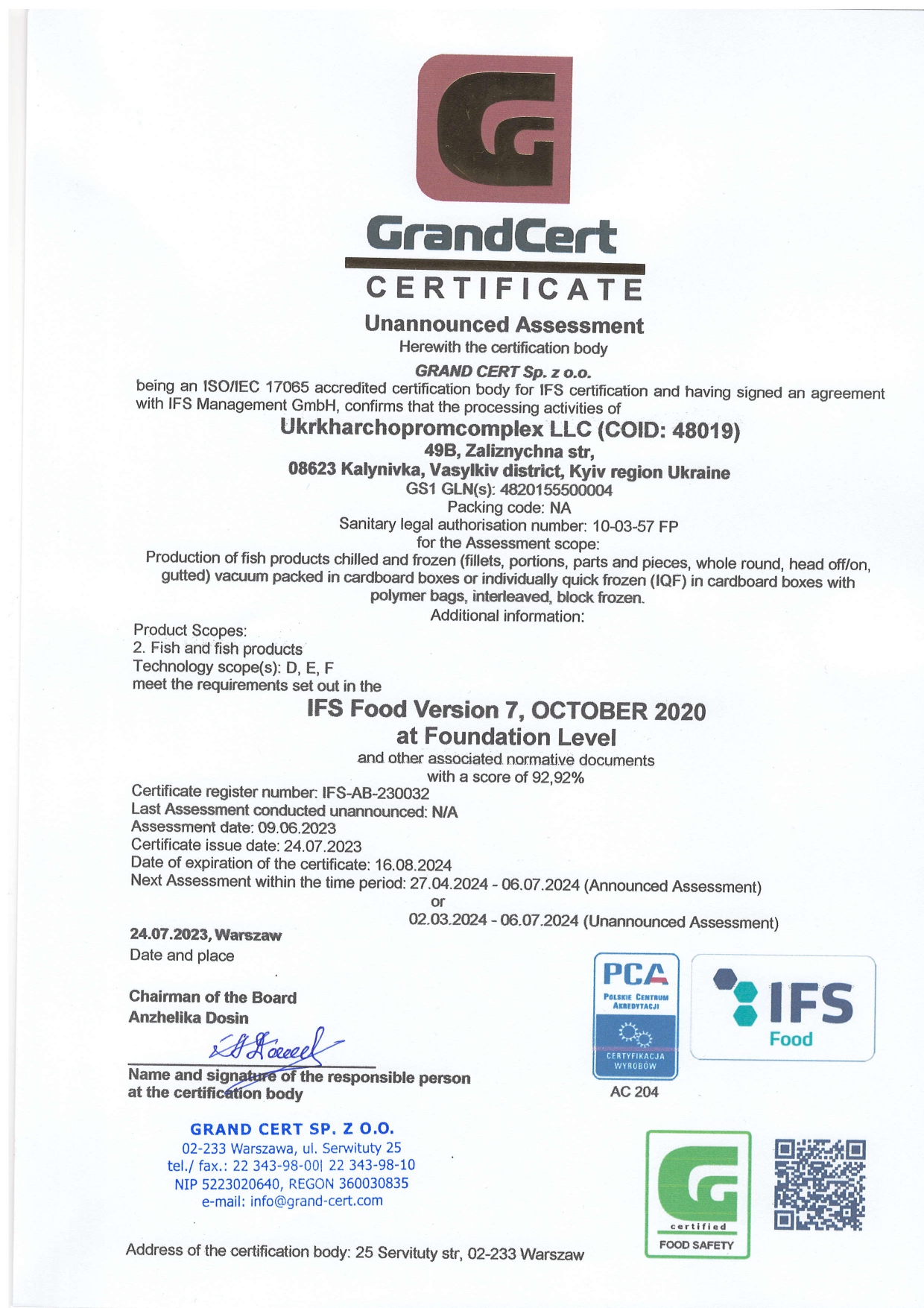 - Підприємство пройшло сертифікацію на відповідність вимогам стандарту A.P. A.I.F. Version 5, який оцінюється як безпека самої вирощеної продукції (аквакультура), безпека всього циклу виробництва і готової продукції. Отримання сертифікату відповідності надає можливість компанії здійснювати переробку сировини та виготовлення готової продукції, яка в подальшому постачається в Європейські мережі роздрібної торгівлі. Проходження сертифікації дозволилоТОВ «УКРХАРЧОПРОМКОМПЛЕКС» збільшити обсяги переробки продукції для Європейського ринку на 30%. На сьогоднішній день Товариство є єдиною компанією-виробником рибної продукції, яке пройшло сертифікацію на відповідність даному стандарту, що є ще однієї з переваг ТОВ «УКРХАРЧОПРОМКОМПЛЕКС».