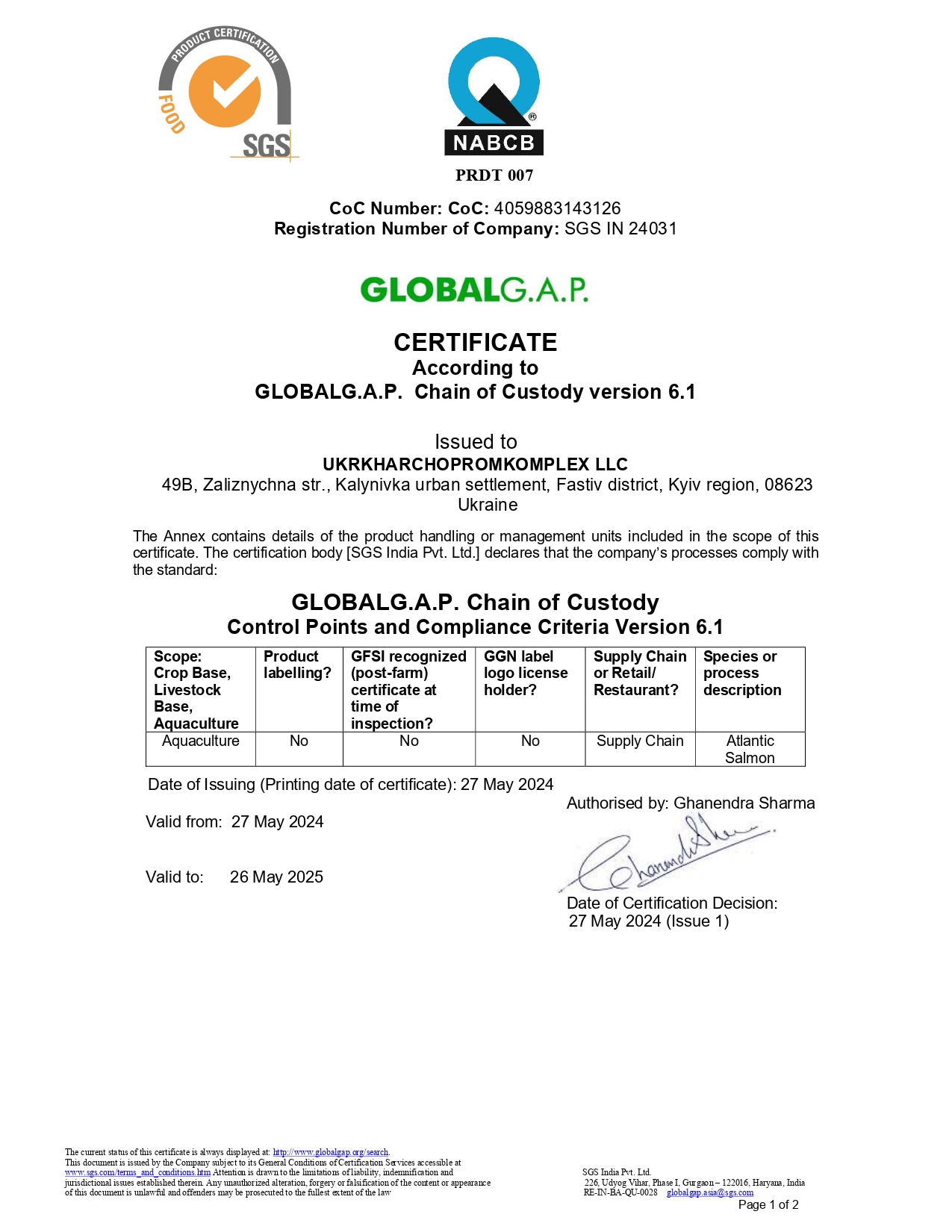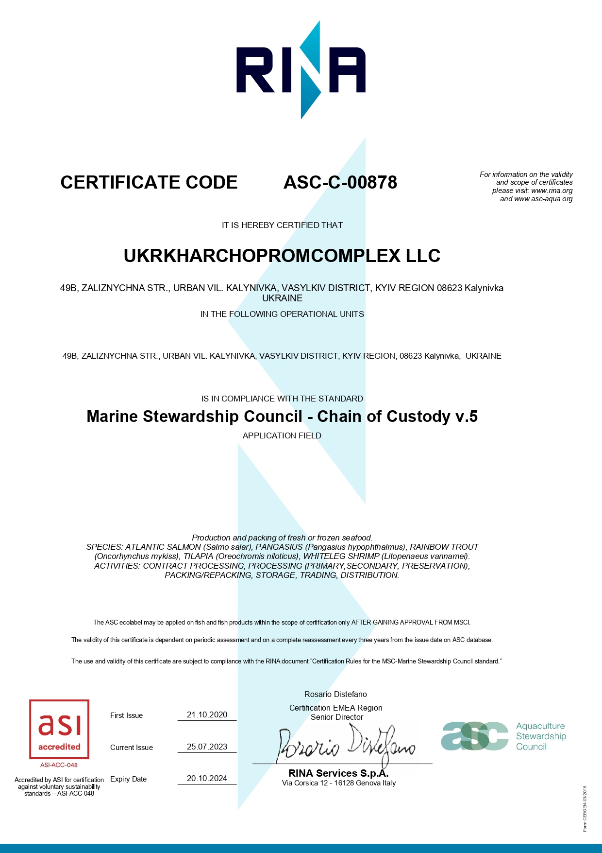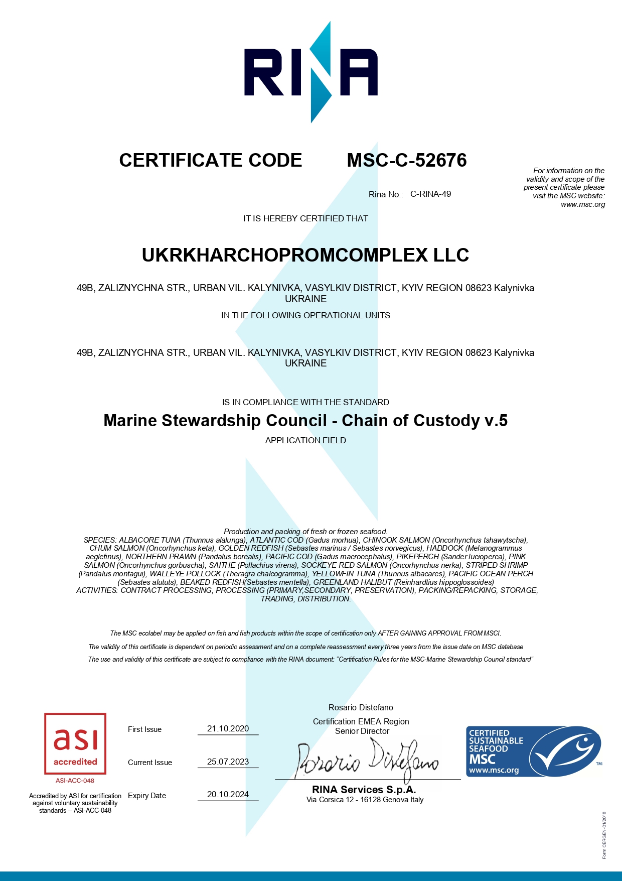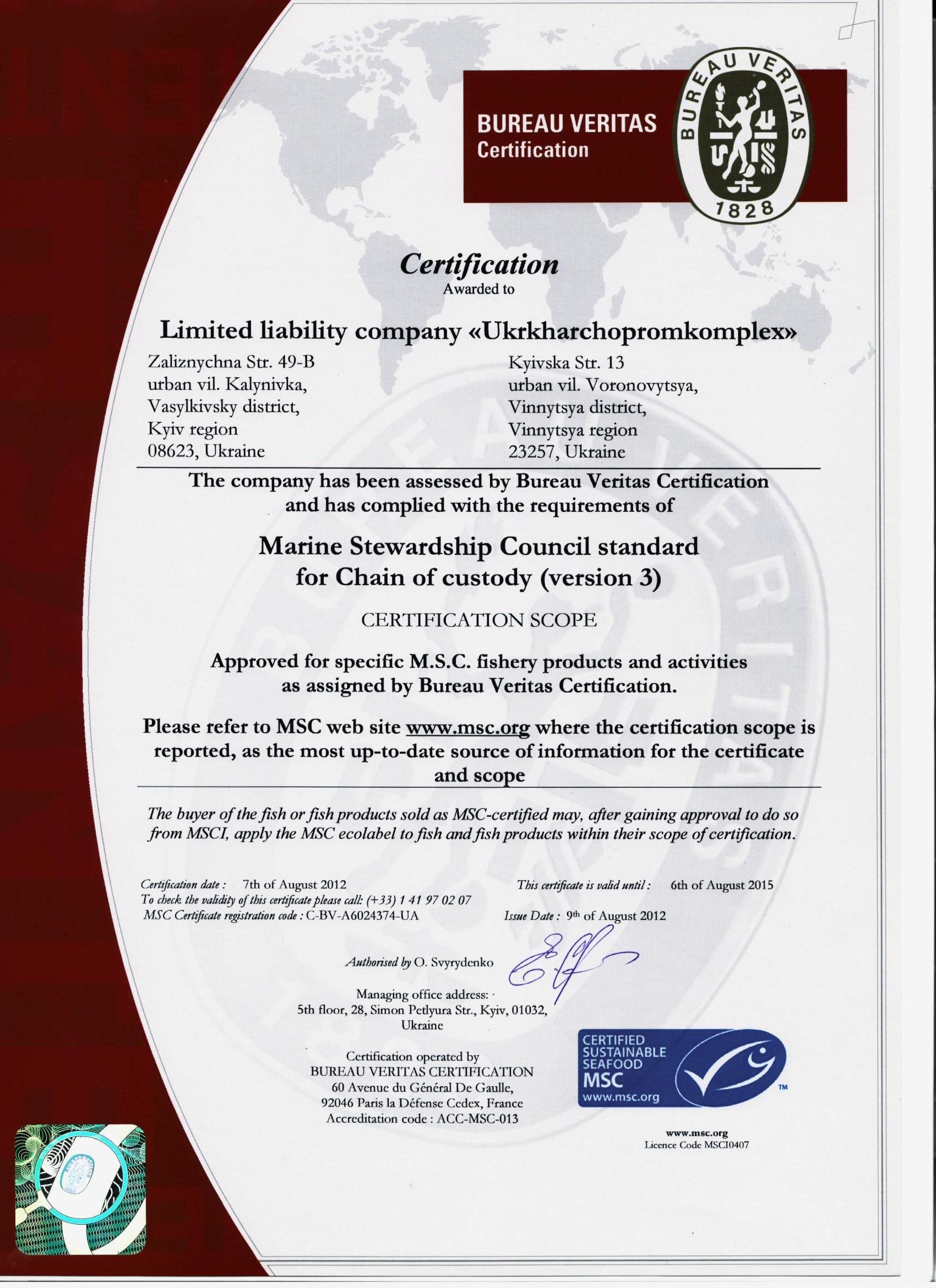 - Підприємством отримано сертифікат MSC CoC (Marine Stewardship Council standard for Chain of custody/СтандартМорський піклувальна радаланцюгапоставок),FSSC22000 - схемасертифікаціїдлявиробників продуктів харчування, IFS Food (version 6) - International Featured Standards - Міжнародні Спеціалізовані Стандарти.