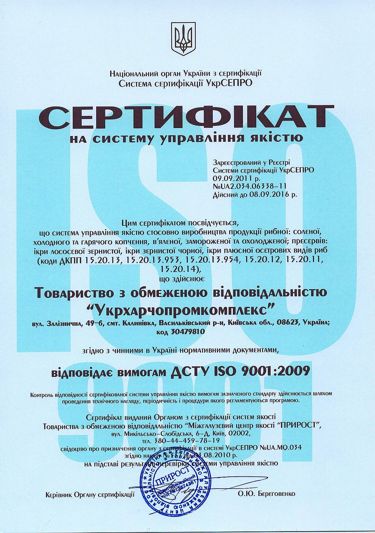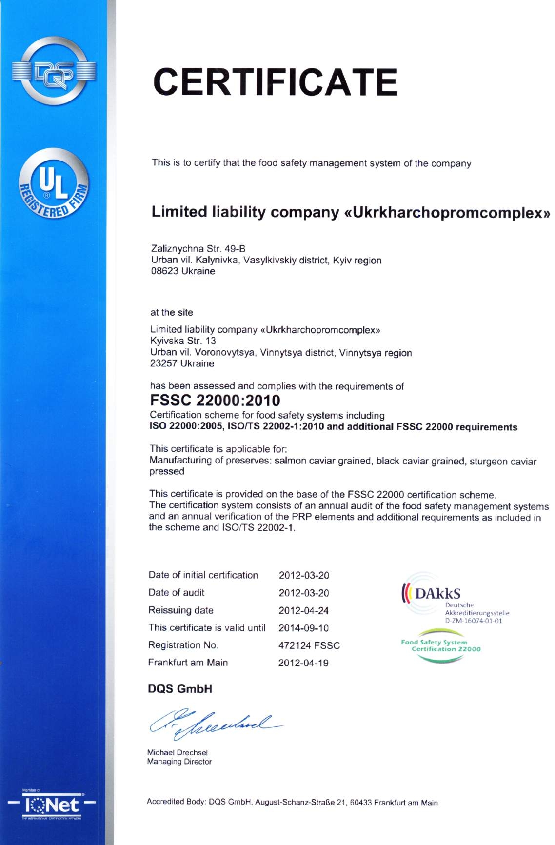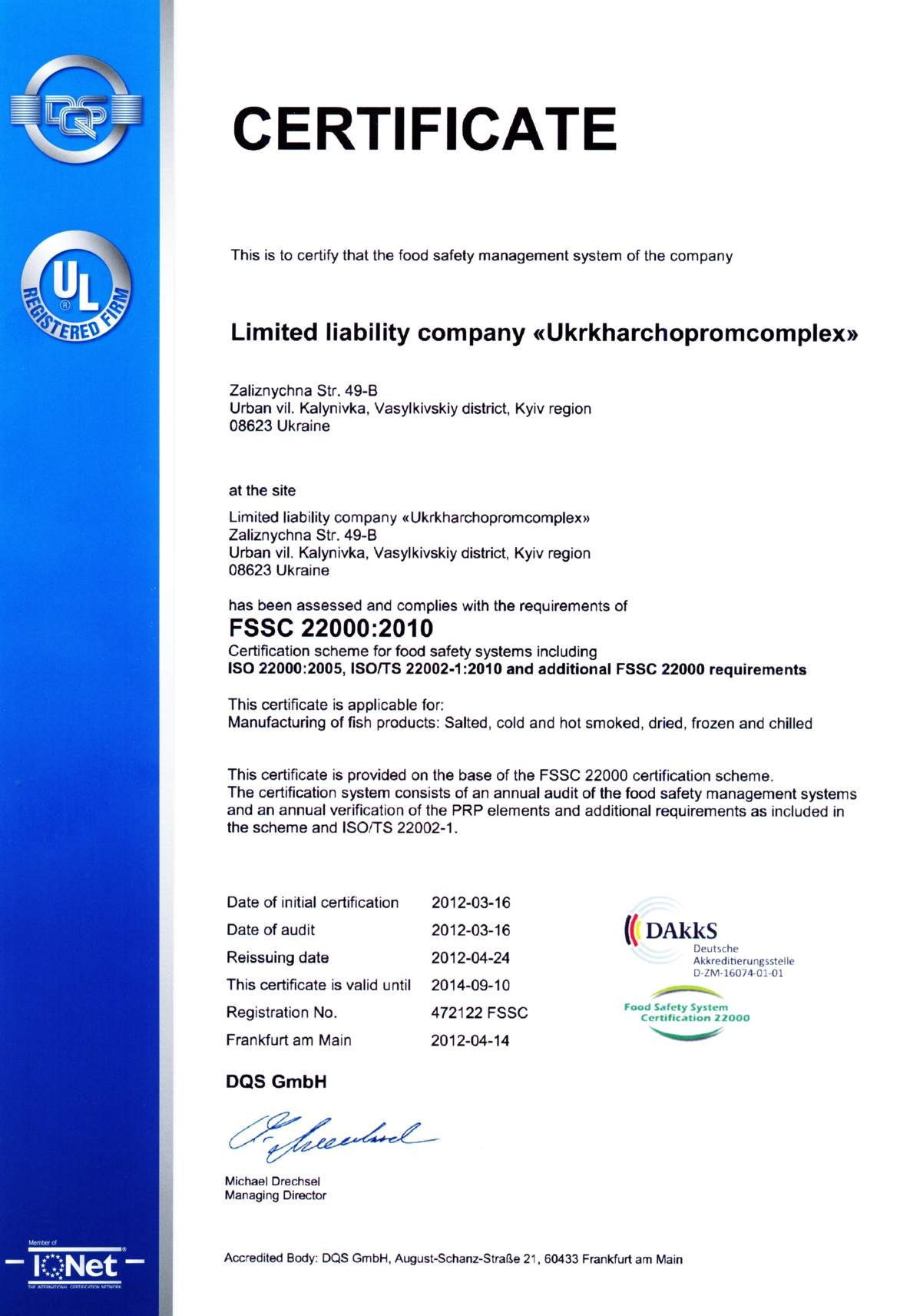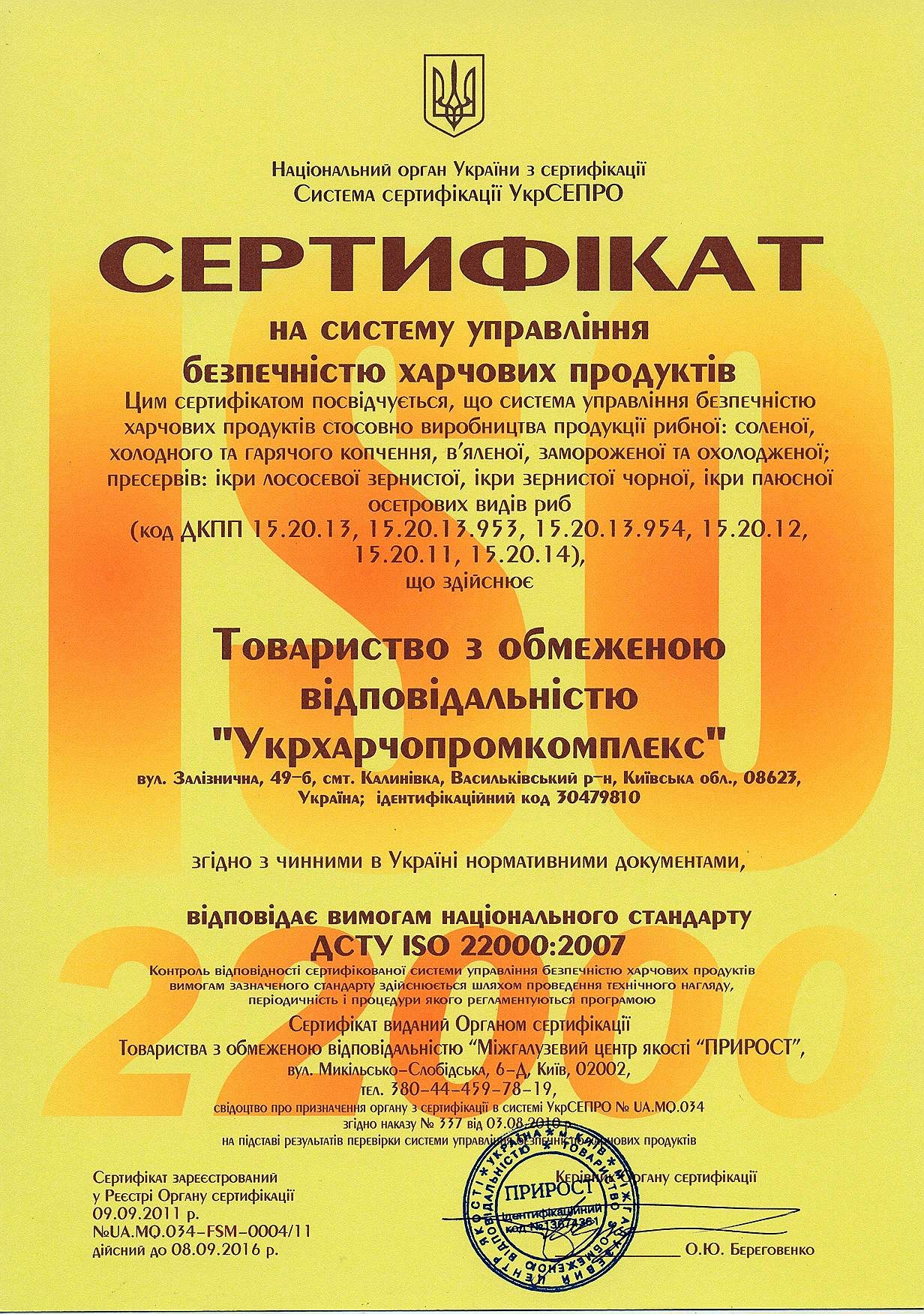 ТОВ «УКРХАРЧОПРОМКОМПЛЕКС» сертифіковане наступними органами щодо сертифікації та отримало наступні сертифікати, що підтверджують відповідність виробництва та продукції міжнародним стандартам: