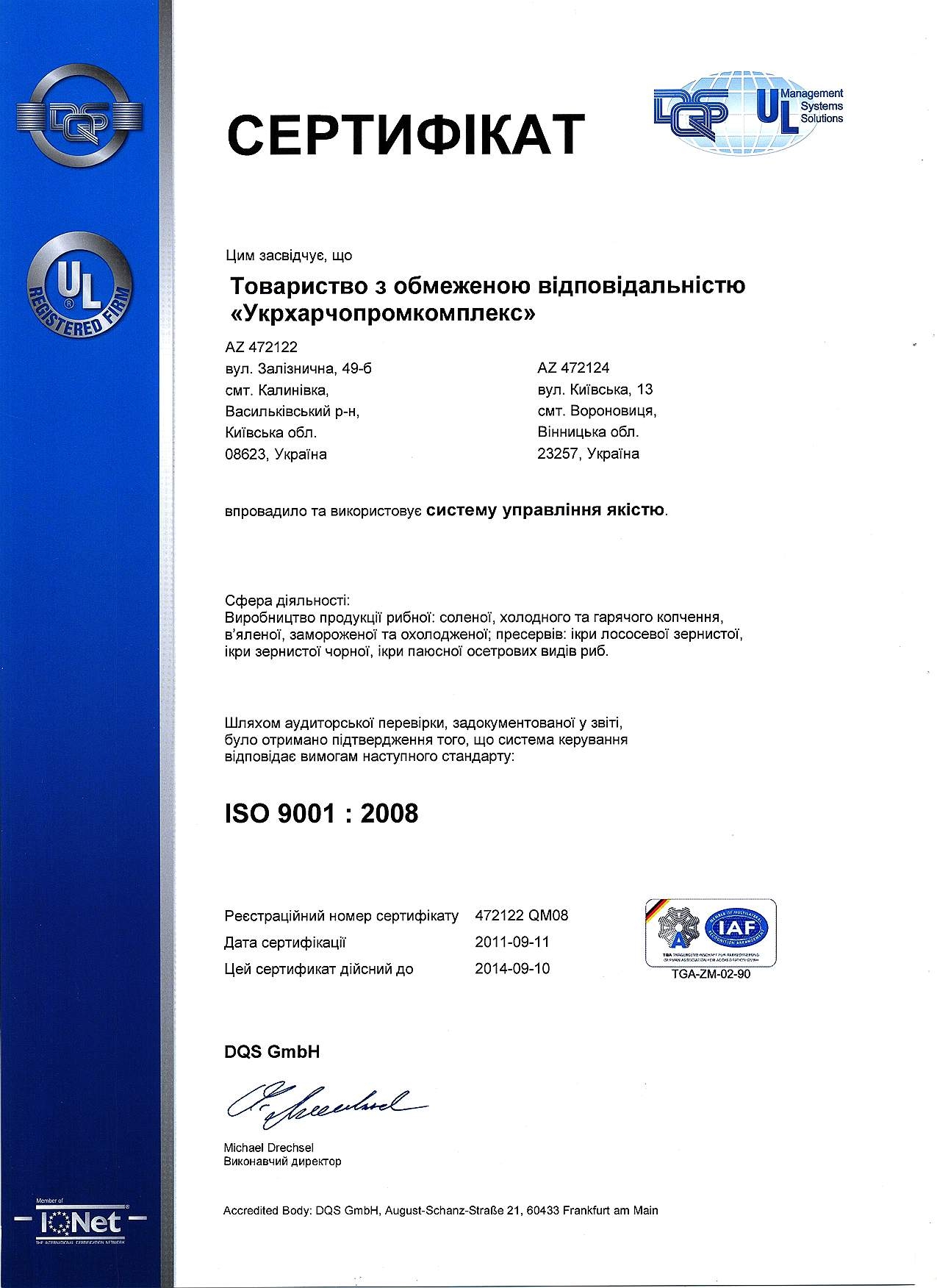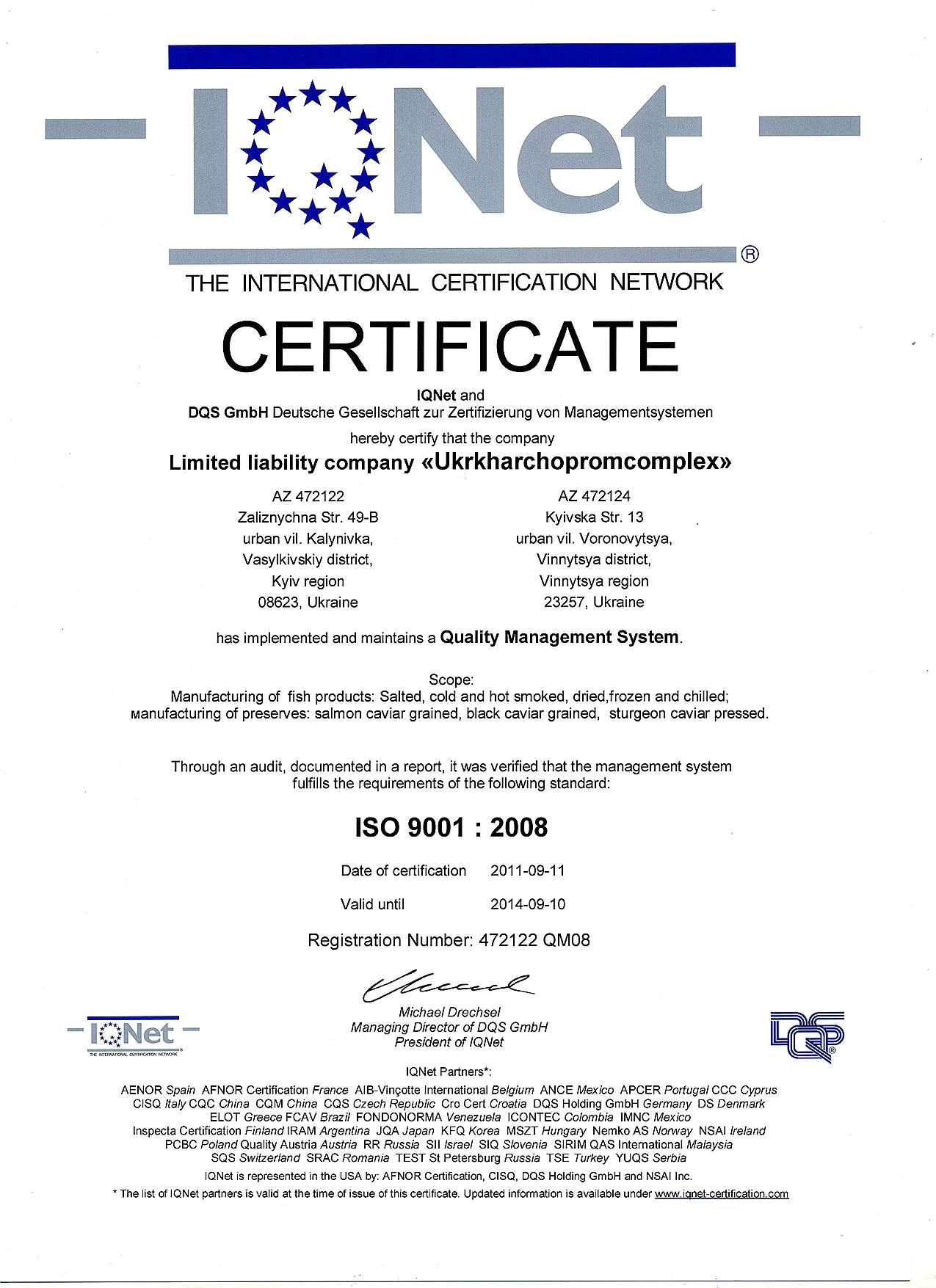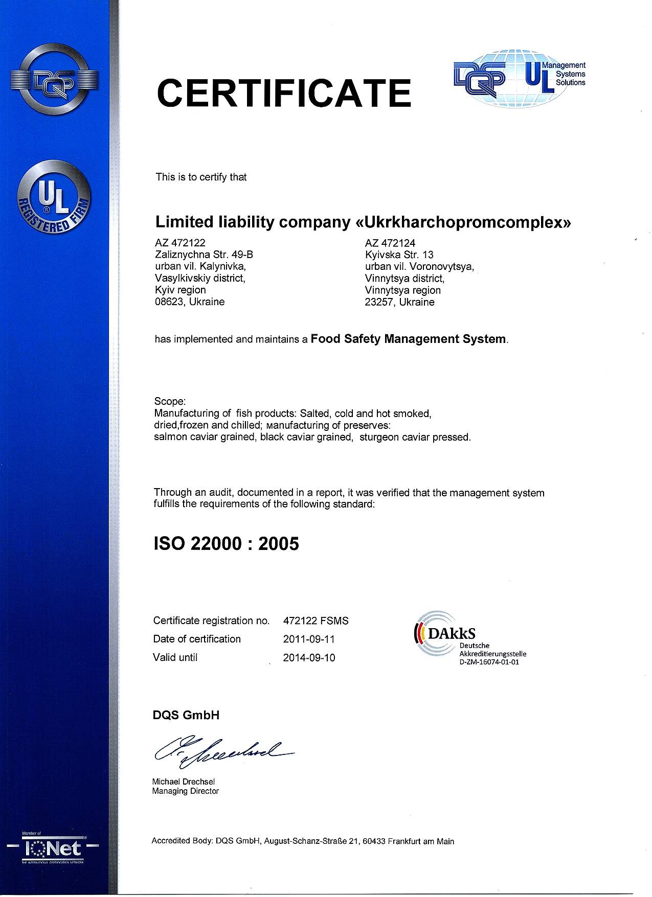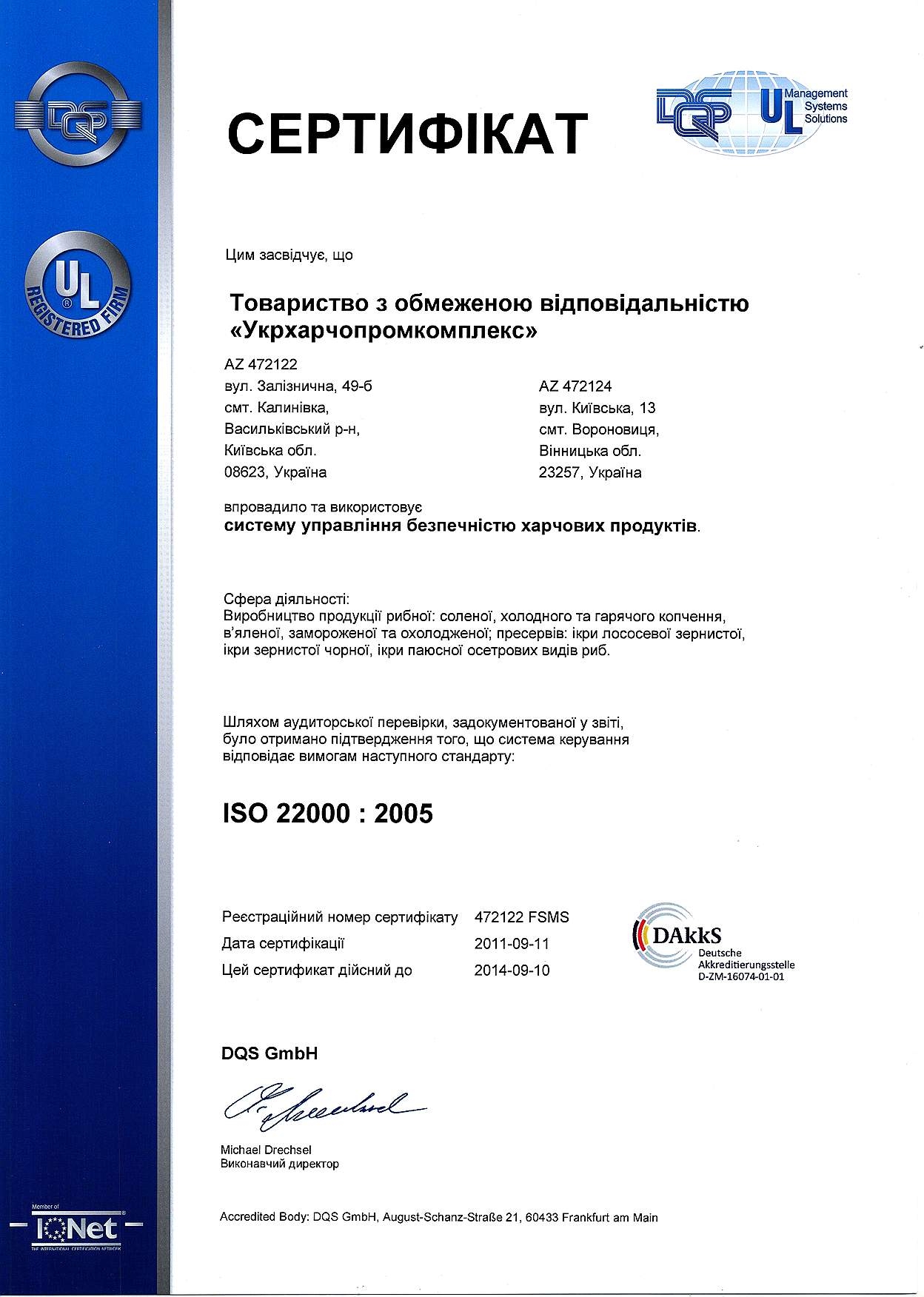ТОВ «УКРХАРЧОПРОМКОМПЛЕКС» сертифіковане наступними органами щодо сертифікації та отримало наступні сертифікати, що підтверджують відповідність виробництва та продукції міжнародним стандартам:
